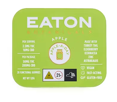 Keep the doc away with Apple-A-Day, an antioxidant packed edible with immunity boosting elderberry, echinacea, zinc and astragalus along with turkey tail mushrooms to keep your body’s natural defense systems on high alert. With a microdose of THC (2.5mg) for a light lift and a healthy amount of calming CBD (10mg) this daily dose of apple supports calm, balance, and everyday vitality. All Eaton Botanicals gummies are made with fast-acting nanotechnology, using real fruit purée with no artificial flavors or dyes, and are always vegan and gluten-free.