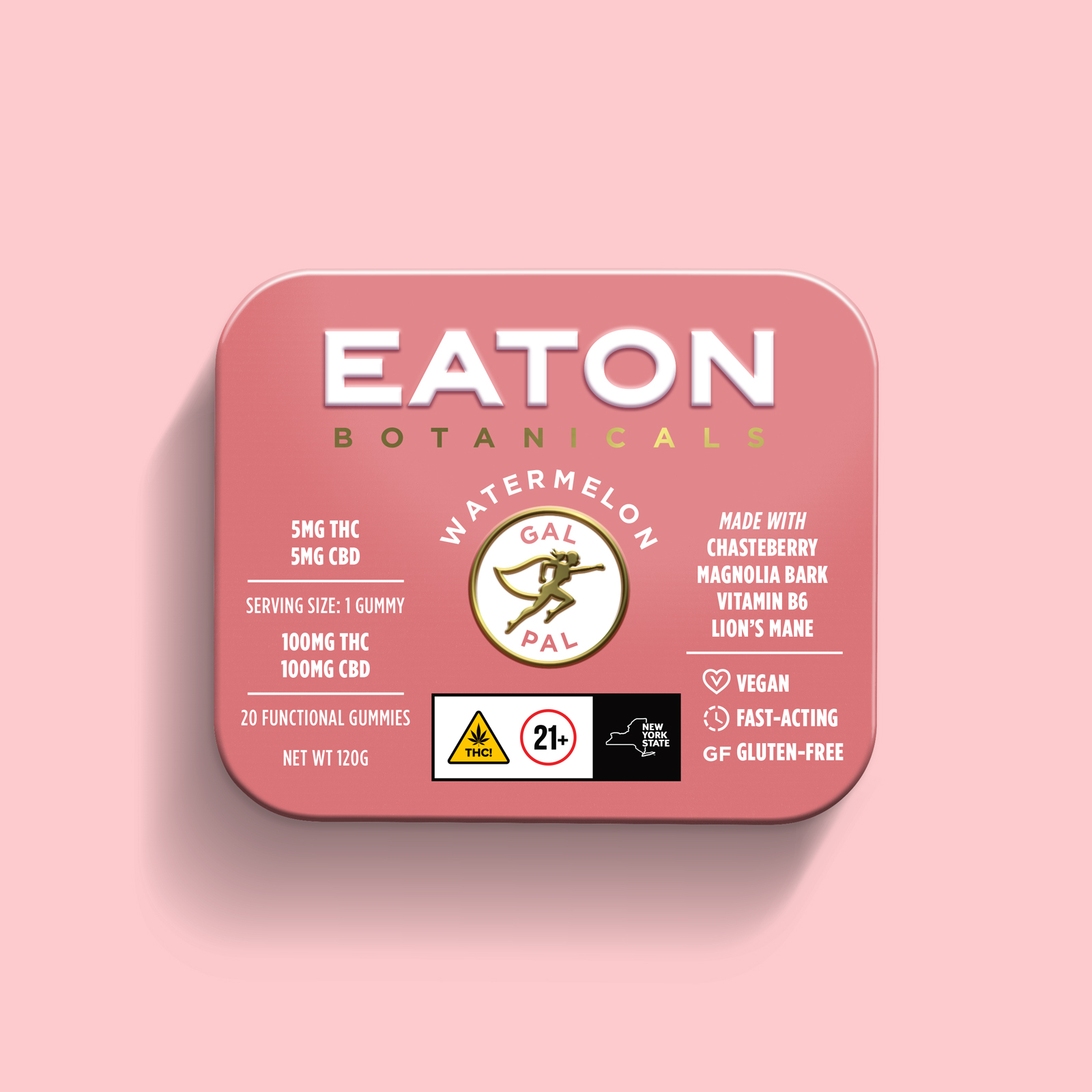 Ladies say hello to Gal Pal your new best friend for anytime of the month. Our 5mg fast-actingfunctional gummy is made with real organic watermelon puree infused with CBD organic lion’smane magnolia bark extract chasteberry and Vitamin B6 to ease PMS and perimenopausesymptoms.5mg THC + 5mg CBD + adaptogens (Lion’s Mane)● Magnolia Bark● Chasteberry● Vitamin B6● Fast-acting nano technology● Vegan & gluten-free● Real fruit pureeNo artificial flavors or dyes