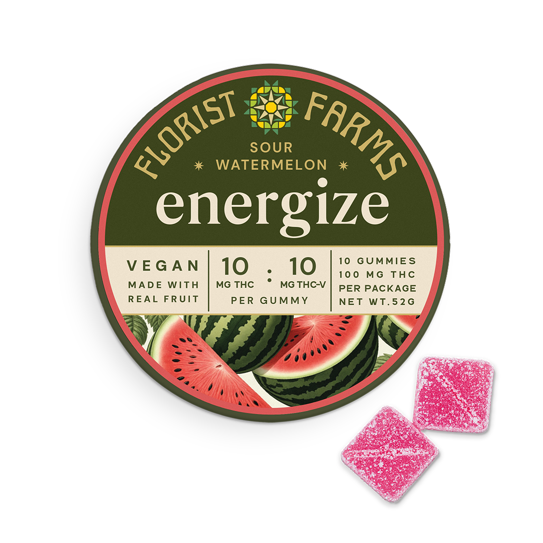 Organic Sugar, Organic Tapioca Syrup, Water, Organic Extra Fine Sugar, Juice Concentrate, Fruit Pectin, Natural Flavoring, Citric Acid, Sodium Citrate, THC Distillate, THCv Isolate, Malic Acid, Organic Sunflower Oil. Based in Cortland, NY, Florist Farms is dedicated to crafting potent products through sustainable, organic, and regenerative farming practices. If you are looking for a brand that prioritizes sustainability and purity, Florist Farms is the brand for you. Vegan. No artificial flavoring or dyes. No corn syrup. Dairy free. Gluten free. Soy free. Tree-nut free. Coconut free.