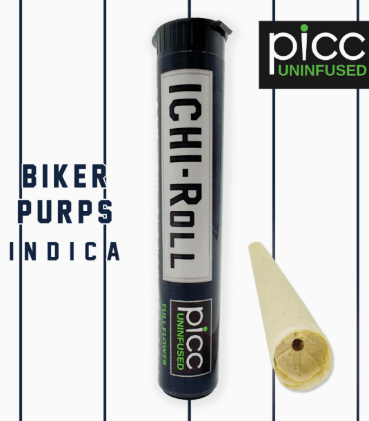Ichi-Roll | Pre-roll 1 Gram | Uninfused Pre-Roll Mixed-light full flower pre-rolls, utilizing patented PICC uninfused platform for the perfect burning experience. Strain: Biker Purps (Indica) THC: 20.2% Batch No.: IR-1g-BP-62325 Flavor Profile: Deep, earthy base with floral and spicy notes, rounded out by subtle hops and an herbal finish. Bold yet smooth from start to finish. Dominant terpenes:α-Bisabolol, β-Caryophyllene, α-Humulene, Linalool, Caryophyllene Oxide Effects: Biker Purps delivers a classic indica experience—full-body relaxation with calming mental clarity. Perfect for unwinding in the evening, easing tension, or settling into a peaceful state. Key Features: Crown Wick™ – Even perimeter ignition for smooth, reliable lighting PLR Tip™ – Path of Least Resistance Tip channels airflow to eliminate start-up runs AIR PAK™ + S.P.A.™ Tech – Eliminates canoeing while maintaining steady, smooth airflow Heat Curve Efficiency – Vaporizes cannabinoids and terpenes at optimal temperature for maximum effectiveness